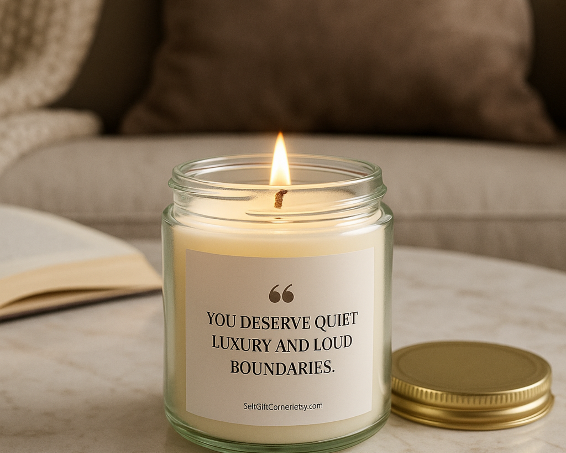 Scented candle with inspirational quote "You Deserve Quiet Luxury and Loud Boundaries", calming aroma for relaxation, self care gift